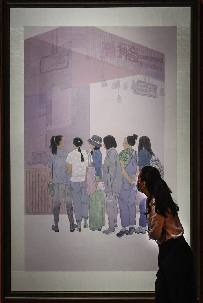 Visitors view the painting Flourishing Age and Happy Xinjiang by artist Xu Ningcheng, at the Xinjiang Art Museum in Urumqi, Xinjiang Uygur autonomous region, July 1, 2022. [Photo/Xinhua]