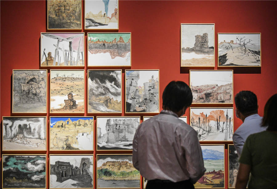 Visitors view the painting Famous Historical Site by artist Zhou Jing, at the Xinjiang Art Museum in Urumqi, Xinjiang Uygur autonomous region, July 1, 2022. [Photo/Xinhua]