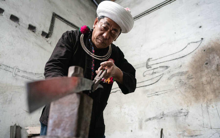 Xiang Laosai, 62, of Achang ethnic group in Husa township, who first learned Husa knife forging from his father when he was 14, has spent most of his time on it since then, delving into it for more than 40 years. Now he is a national-level representative inheritor of this technique.