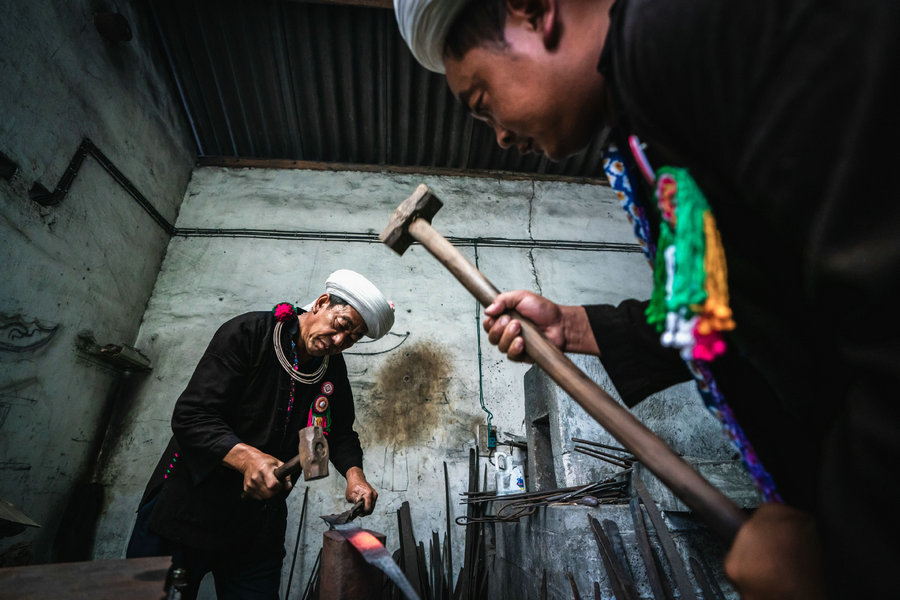 Xiang Laosai forges a Husa knife with his apprentice at Lasa village of Husa township, Longchuan county of southwest China's Yunnan province, on Aug. 5, 2022. [Photo/Xinhua]