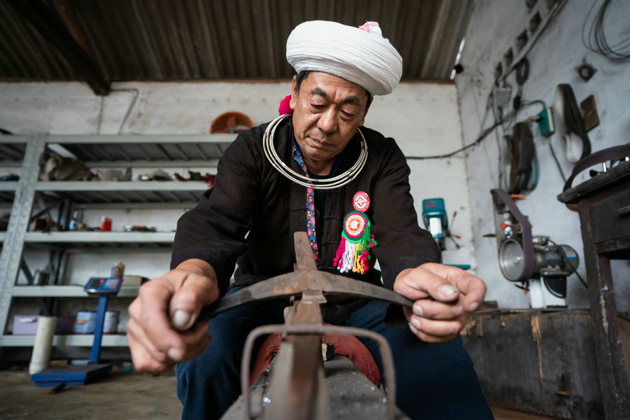 Xiang Laosai sharpens a Husa knife at Lasa village of Husa township, Longchuan county of Southwest China's Yunnan province, on Aug. 5, 2022. [Photo/Xinhua]