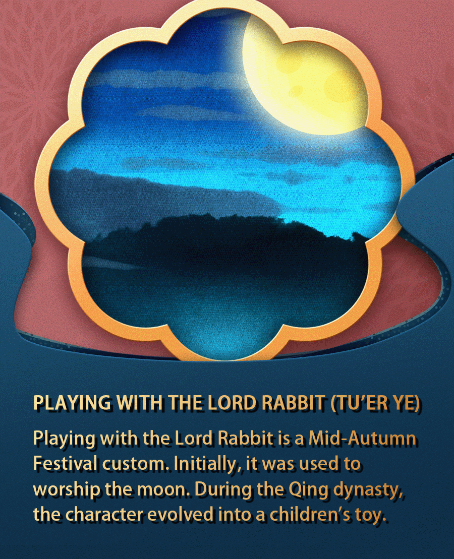 Playing with the Lord Rabbit is a popular Mid-Autumn Festival custom in northern China. According to legend, after Chang'e flew into the sky and landed on the moon, she lived in the Moon Palace with a rabbit. Therefore, the image of the Lord Rabbit has gradually been deeply rooted in people's hearts with the evolution of folklore.