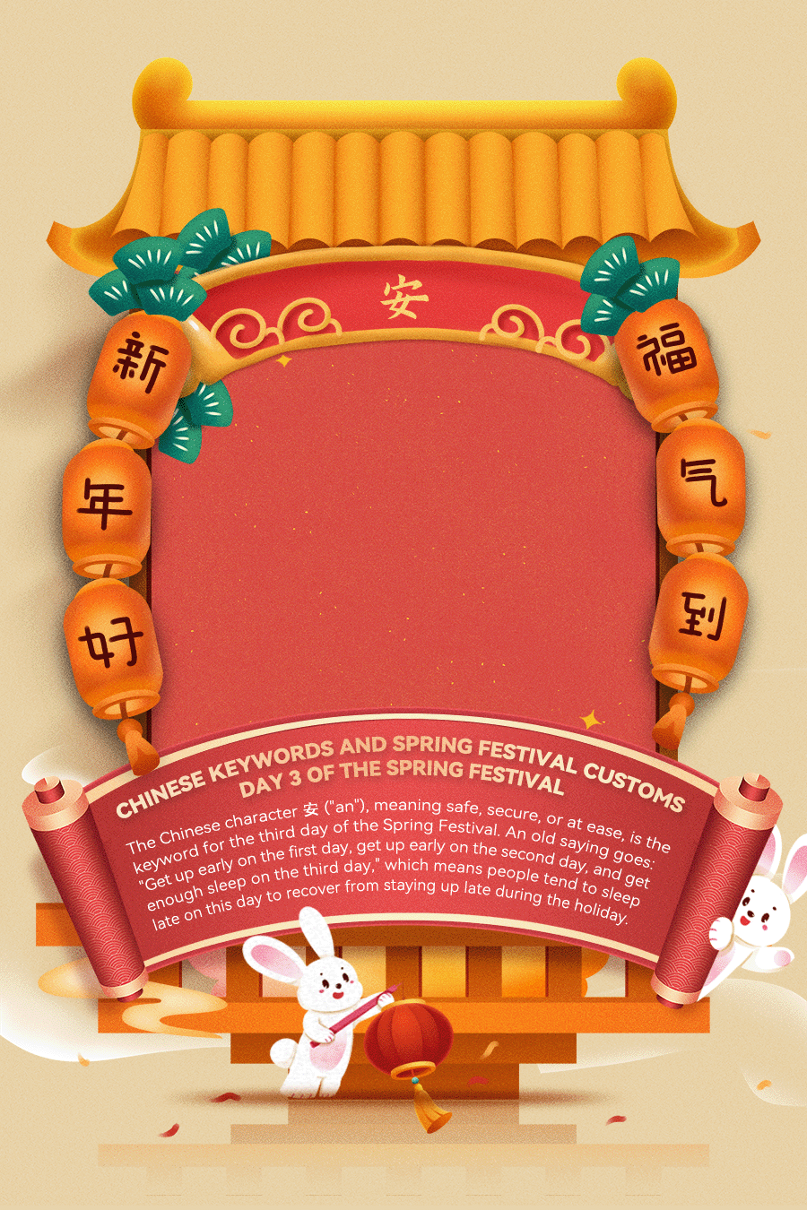 The Chinese character 安 ("an"), meaning safe, secure, or at ease, is the keyword for the third day of the Spring Festival. This year, it falls on Jan. 24.