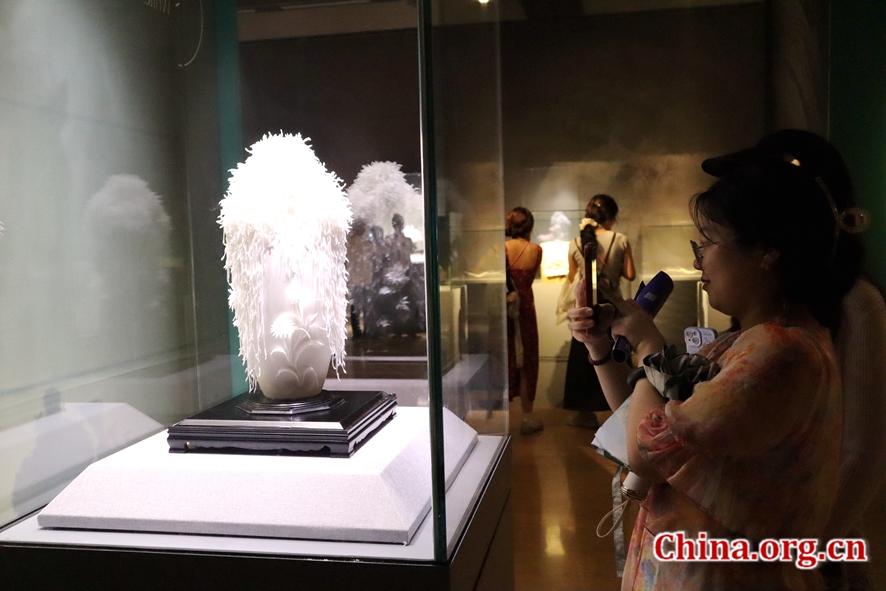 A visitor takes photos of an intricate piece of white porcelain at an exhibition showcasing Dehua porcelain in Dongcheng district, Beijing, July 28, 2024. [Photo by Yan Bin/China.org.cn]