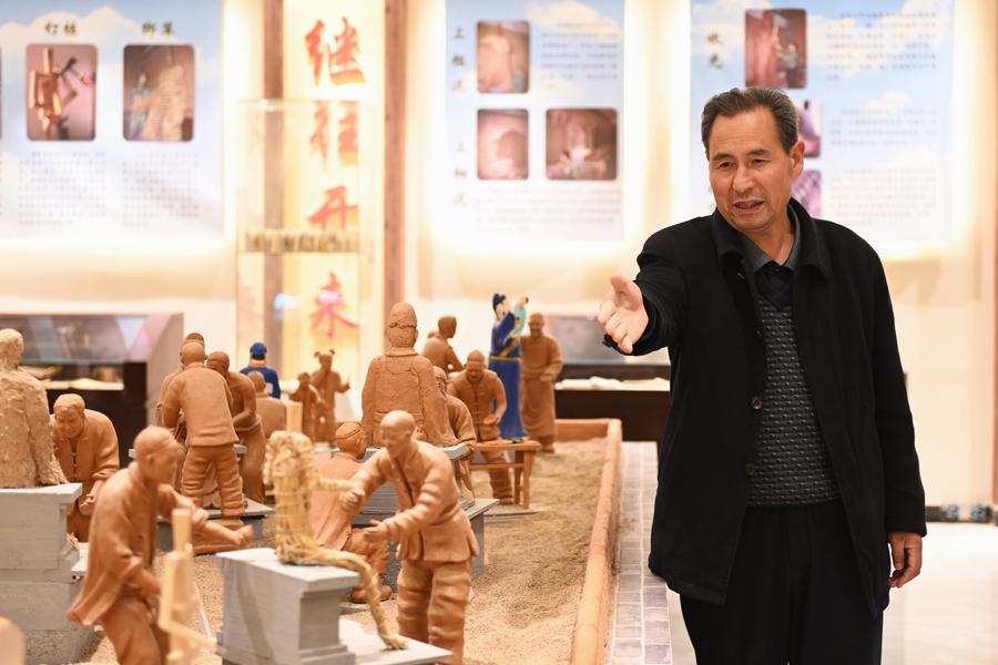 Yang Jianian introduces the procedure of making painted sculpture at a gallery of Yang's painted sculpture in Longde County, northwest China's Ningxia Hui Autonomous Region, on Oct. 31, 2024. [Photo/Xinhua]