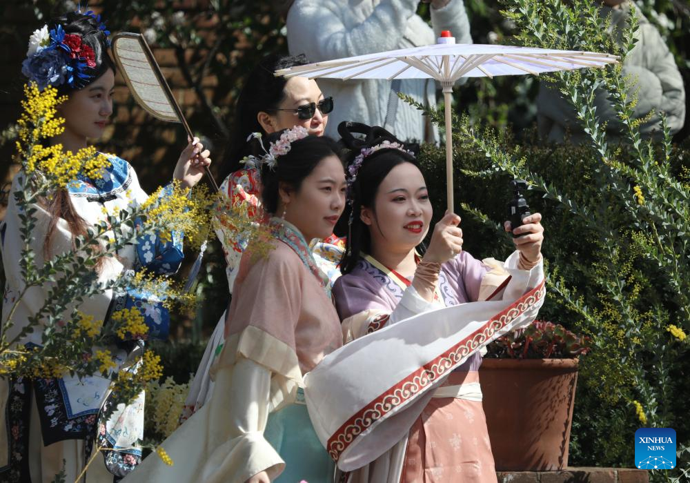 Hanfu enthusiasts pose for selfies during a celebration of the Huazhao Festival, or the flower goddess' birthday, at the Filoli Historic House & Garden in Woodside, California, the United States, March 1, 2025. (Photo by Liu Yilin/Xinhua)