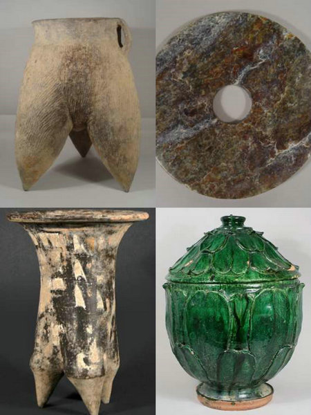 The items include pottery, jade, bronze ware and Buddhist artifacts. Among them is a bronze "money tree" with a ceramic base and a pottery figurine of an entertainer.
