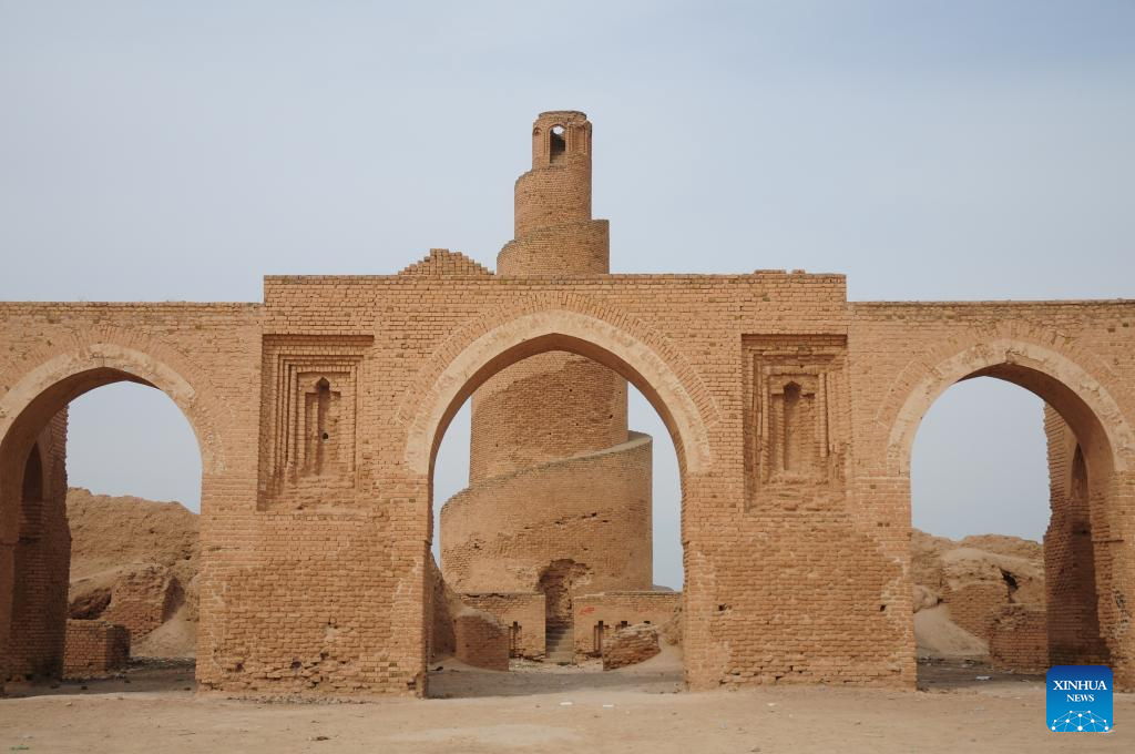 This photo taken on March 3, 2025 shows the spiraling minaret of Abu Dulaf Mosque on the outskirts of Samarra, in Salahuddin province, Iraq. Samarra Archaeological City, located about 130 km north of Iraqi capital Baghdad, contains the remains of an iconic Islamic city that during most of the 9th century served as the capital of the Abbasid Empire, and has been on UNESCO's list of World Heritage in Danger since 2007. [Photo/Xinhua]
