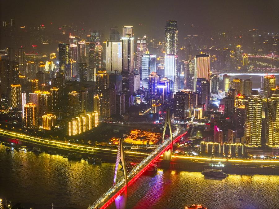 An aerial drone photo shows a night view of the downtown area of Chongqing, southwest China, Feb. 28, 2025. (Xinhua/Wang Quanchao)
