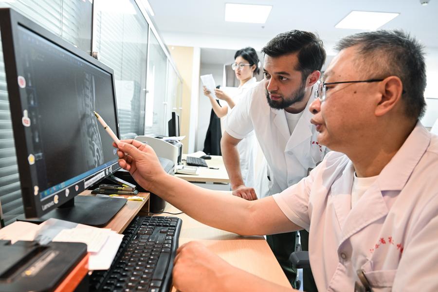 Kishvarov Amirdzhon (C) analyses a patient's examination data under the guidance of his supervisor Zhang Jianbin (R) at the Second Affiliated Hospital of Nanjing University of Chinese Medicine (Jiangsu Provincial Second Chinese Medicine Hospital) in Nanjing, east China's Jiangsu Province, April 18, 2025. [Photo/Xinhua]