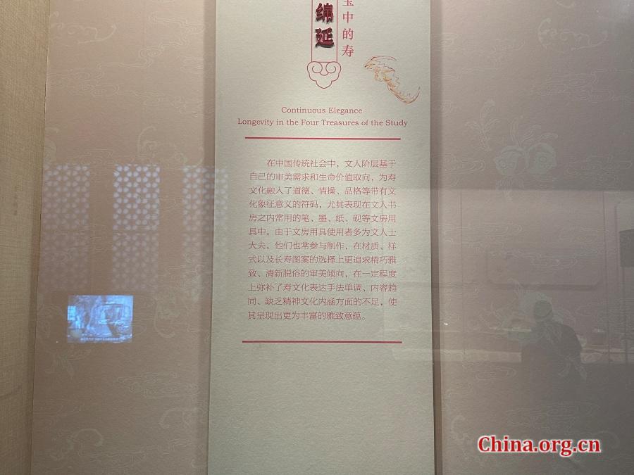 A collection of literary artifacts reflecting the scholar class's interpretation of longevity at the Beijing Art Museum in Wanshou Temple, June 19, 2025. Items such as inkstones and brush rests are adorned with subtle motifs and inscriptions praising moral virtue and enduring life. [Photo by Liu Ziying/China.org.cn]