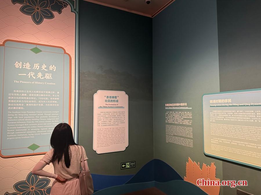 A visitor inspects an information panel in "A Peranakan Culture Exhibition on the Maritime Silk Road" at the Capital Museum, Beijing, June 24, 2025. Titled "The Pioneers of History Creation," the display honors the Baba-Nyonya ancestors who established enduring cross-cultural communities through intermarriage and economic leadership, contributing to Southeast Asia's social development. [Photo by Liu Ziying/China.org.cn]