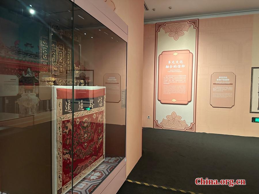 A home altar in "A Peranakan Culture Exhibition on the Maritime Silk Road" at the Capital Museum, Beijing, June 24, 2025. Titled "Altars in Chinese Peranakan Homes," the display shows how the local spiritual landscape was shaped by Confucianism, Taoism, Buddhism, local beliefs, and later, Christianity. This reflects the community's open approach to faith. [Photo by Liu Ziying/China.org.cn]