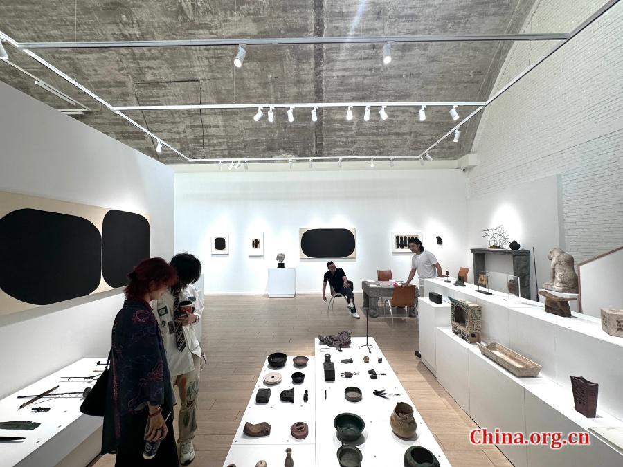 "The Light Between Ancient Cracks" exhibition intersperses Mao Xinguo’s abstract ink works with ancient relics at Hiart Space in Beijing, July 23, 2025. No labels are provided, allowing visual relationships to emerge organically. [Photo by Liu Ziying/China.org.cn]