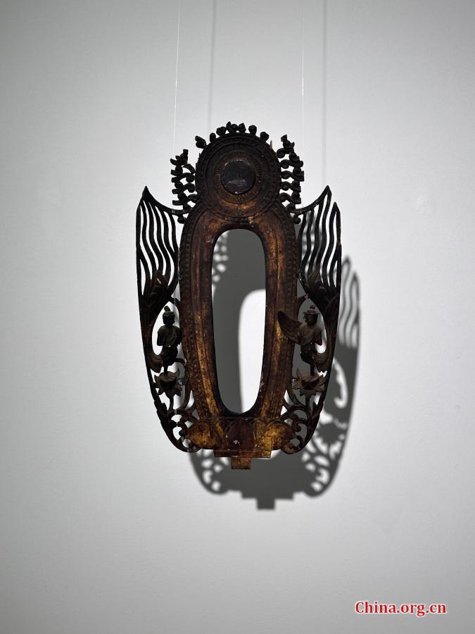 A wooden Kalavinka Buddha light from Japan's Kamakura period (1185-1333) at Hiart Space in Beijing, July 23, 2025. The work embodies both sacred sound and sculptural silence. [Photo by Liu Ziying/China.org.cn]