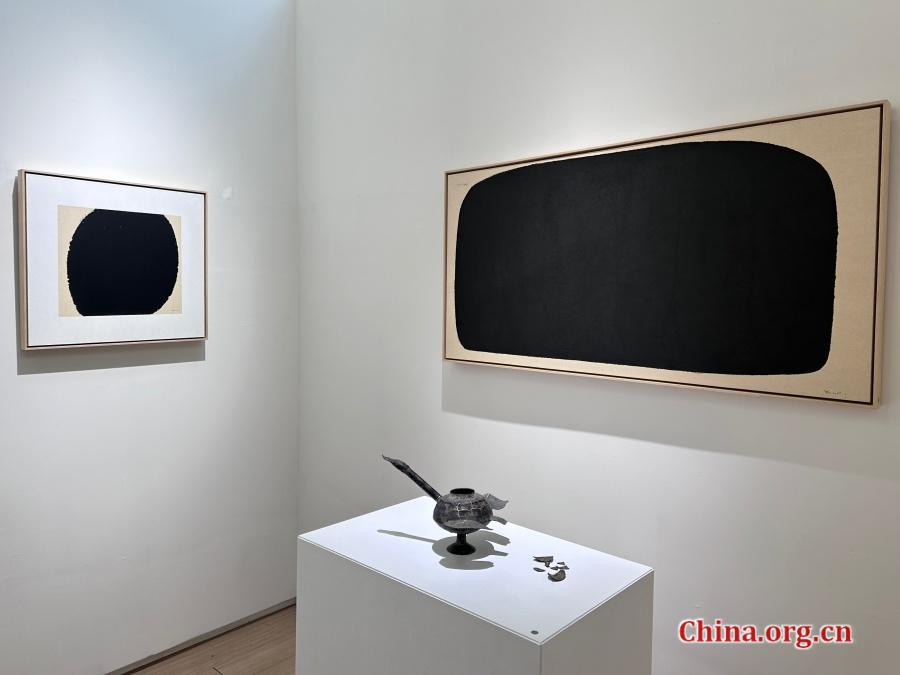 Paintings from Mao Xinguo's "Ink Style" series are juxtaposed with ancient objects at Hiart Space in Beijing, July 23, 2025. Their coexistence in the same visual field evokes a temporal overlap — two modes of inscription across time. [Photo by Liu Ziying/China.org.cn]