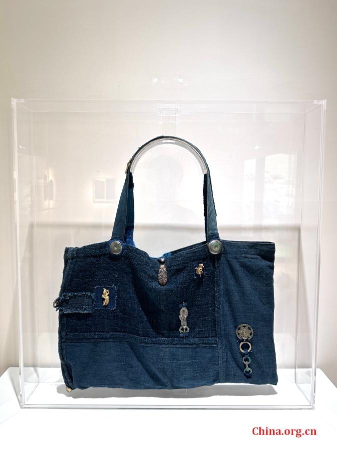 A cloth pouch in the Japanese wabi-sabi aesthetic titled "Walking Time" on display at Hiart Space in Beijing, July 23, 2025. The curator decorated the cloth pouch with ancient objects to create a sense of timelessness. [Photo by Liu Ziying/China.org.cn]