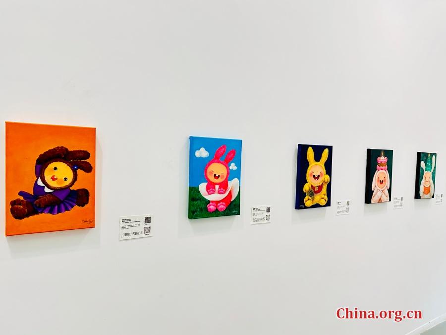 A wall displaying multiple works by artist Sophia Zhao at the "Too Happy: Live Like a Bunny" exhibition at Winners Gallery in Beijing, July 25, 2025. [Photo by Liu Ziying/China.org.cn]