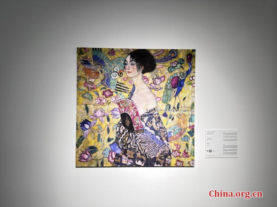 "Lady with a Fan," one of Klimt's final works, on display in "The Golden Age" exhibition at Beijing Fun, July 28, 2025. With its sensuous composition and East Asian decorative motifs, the piece reflects intercultural dialogue and the artist's enduring fascination with feminine grace. [Photo by Liu Ziying/China.org.cn]