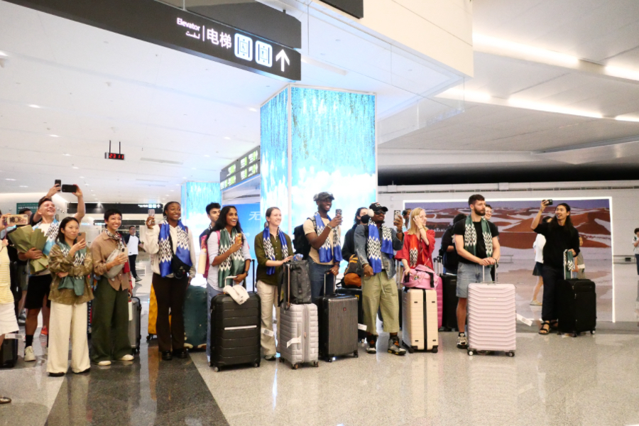 The cast and crew of the Limón Dance Company from the United States watch a welcome performance by members of a local Xinjiang dance troupe at Tianshan Airport in Urumqi, northwest China's Xinjiang Uygur Autonomous Region, July 30, 2025. [Photo by Yang Chuanli/China.org.cn]