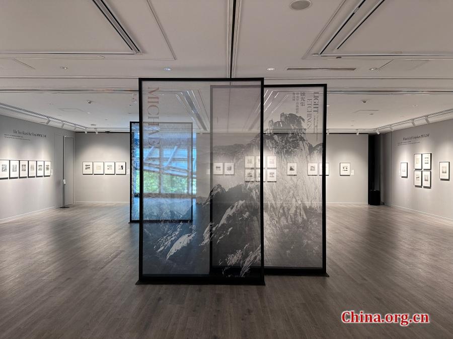 A folding screen printed with panoramic mountain scenes by Michael Kenna is displayed at the "Light Etchings" exhibition at KWM Art Center in Beijing, July 30, 2025. The installation merges Eastern display traditions with Kenna's modern meditative aesthetic. [Photo by Liu Ziying/China.org.cn]