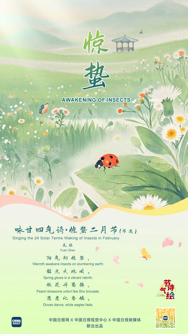 As spring thunder rolls, all life unfolds. Awakening of Insects, the third term of the 24 Solar Terms, is nature's wake-up call. In the words of Tang Dynasty poet Yuan Zhen, "Warmth awakens insects on slumbering earth; Spring glows in a vibrant rebirth." May this prelude of spring bring you new hope in life.