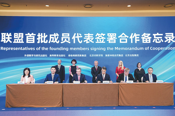 Representatives of the founding members sign the memorandum of cooperation at the launch of the Association for International Publishing Education during the 3rd International Conference on Publishing Education in Beijing. [Photo/CHINA DAILY]