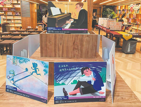 The public-interest art exhibition in a Beijing bookstore is dedicated to raising awareness on tenosynovial giant cell tumor, a rare joint disorder. LI HENG/XINHUA