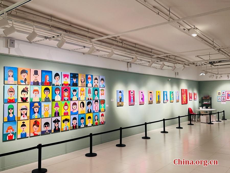 This photo, taken on Sept. 2, 2025, shows the work "Restart Beautiful Life." The piece features 48 small paintings, with each telling a distinct life story. Using "empty eyes" — a motif drawn from archetype theory in psychology — the piece reveals unmasked interiority lingering behind seemingly cheerful painted expressions. [Photo by Liu Ziying/China.org.cn]
