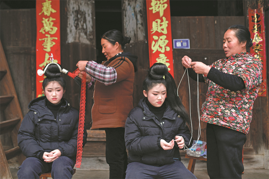 Relatives help the twins tie their hair into buns before attending the Gannangxiang Lusheng Festival.[Photo provided by Yang Wenbin/Xinhua]