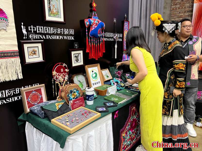 A booth displays Chuxiong Yi embroidery handicrafts at the "Orchids in Bloom" fashion show, Beijing, Sept. 7, 2025. [Photo by Li Congrong/China.org.cn]
