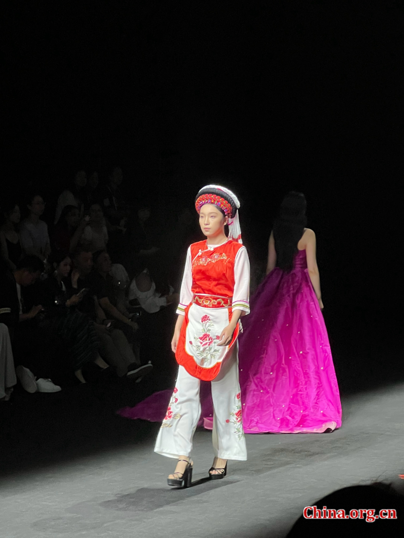 A model presents a traditional costume of the Bai people at the "Orchids in Bloom" fashion show, Beijing, Sept. 7, 2025. The majority of the Bai people live in Dali Bai autonomous prefecture, Yunnan province. [Photo by Li Congrong/China.org.cn]
