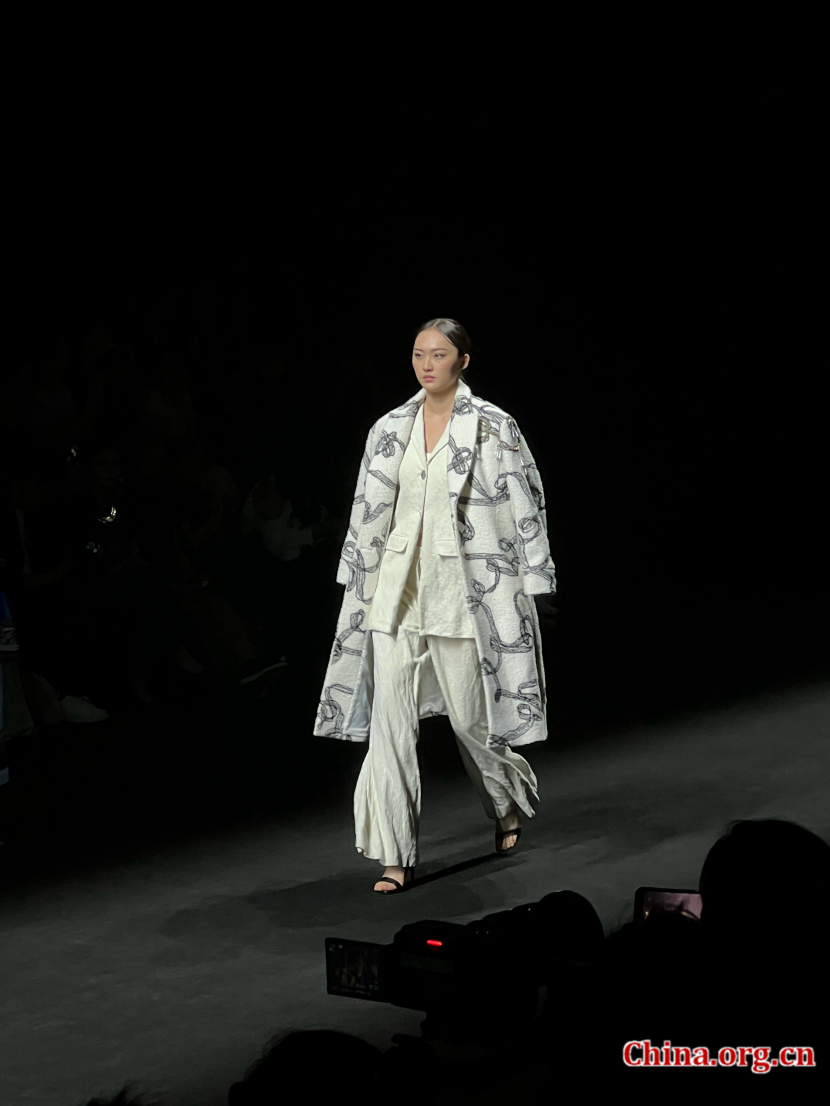 A model presents a creation featuring Yi embroidery at the "Orchids in Bloom" fashion show, Beijing, Sept. 7, 2025. The outfits featuring Yi embroidery showcased at the event were presented by Chuxiong Yi autonomous prefecture, Yunnan province. [Photo by Li Congrong/China.org.cn]