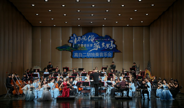 Under the baton of conductor Liu Sha, erhu virtuoso Gao Bai holds a solo recital in Jinan on Sept 7. [Photo provided to chinadaily.com.cn]