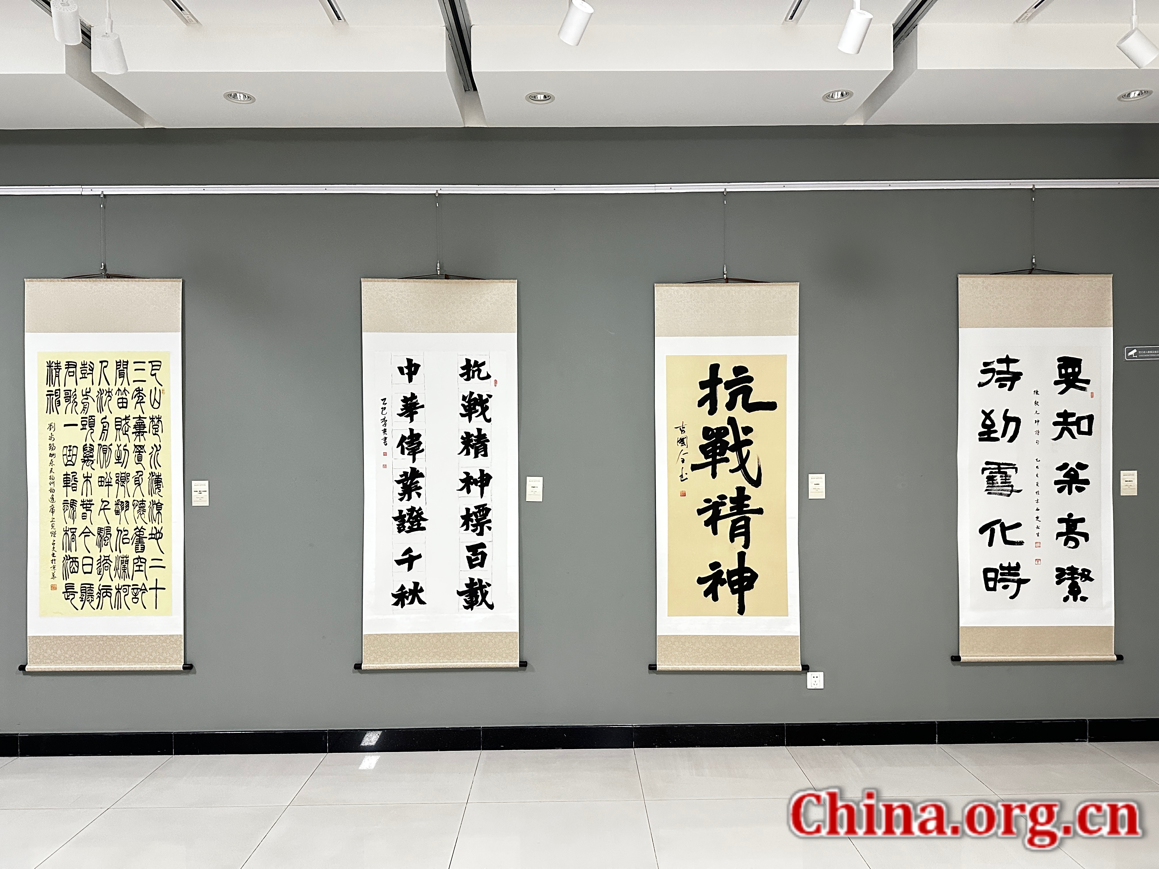 Calligraphy works expressing the spirit of the Chinese People's War of Resistance Against Japanese Aggression are displayed at the seventh calligraphy exhibition at the Cultural Center of Xicheng District, Beijing, Sept. 17, 2025. [Photo by Liu Ziying/China.org.cn]
