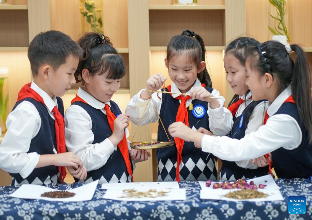 Students measure herbs of traditional Chinese medicine (TCM) at an elementary school in Taizhou City, east China's Jiangsu Province, Oct. 22, 2025. Lessons on TCM were introduced in various ways across the country to welcome the annual World Traditional Medicine Day which falls on Oct. 22. (Photo by Zhou Shegen/Xinhua)
