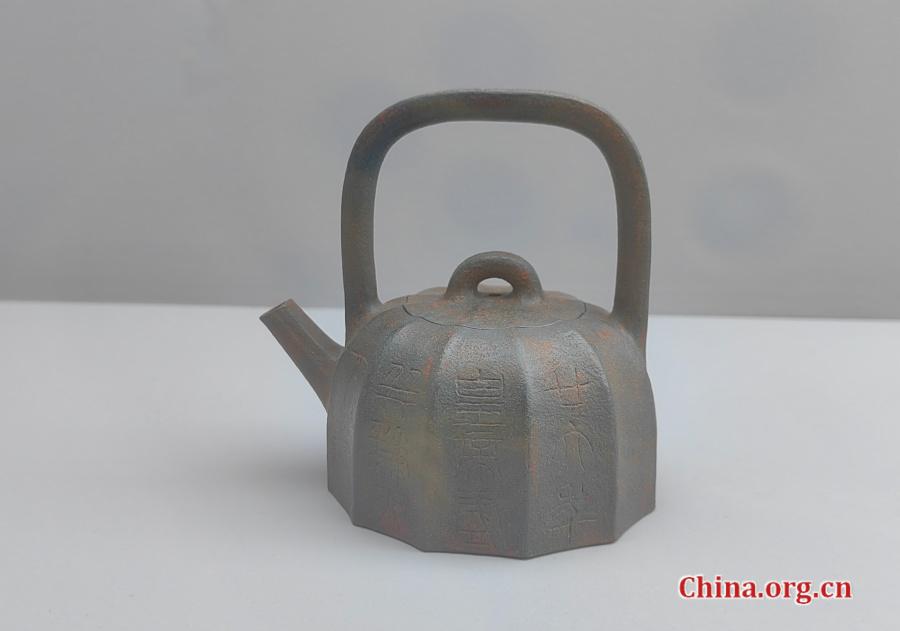 A zisha teapot inscribed with the decree of the first emperor of the Qin dynasty (221-207 B.C.) on unifying weights and measures on display in ceramic artist Wang Qiang's solo exhibition at the National Art Museum of China in Beijing, running from Oct. 15-28, 2025. [Photo by Liu Sitong/China.org.cn]