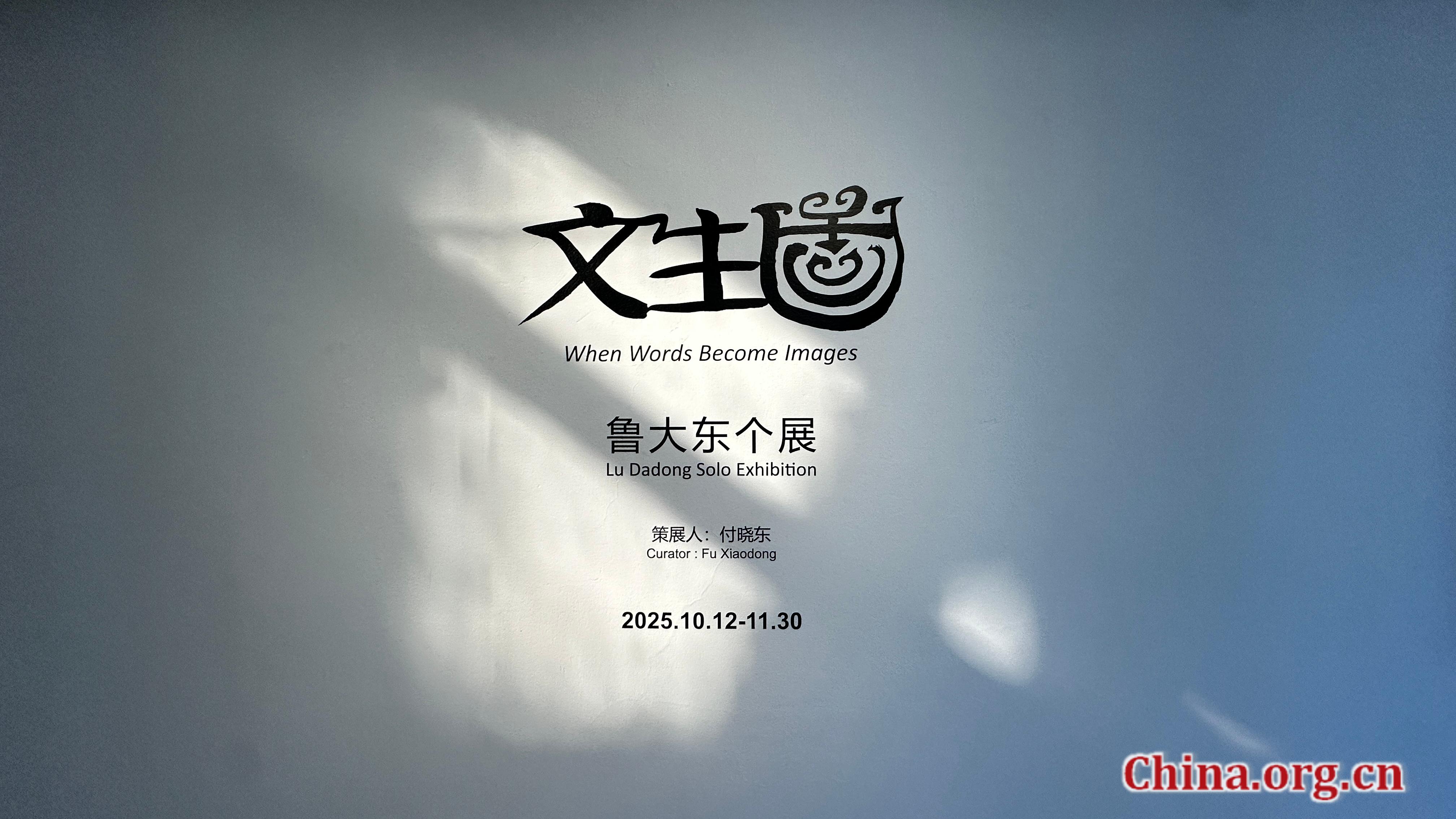 The exhibition banner for "When Words Become Images," a solo exhibition of works by Lu Dadong, at Space Station Gallery, Beijing's 798 Art District, Oct. 21, 2025. [Photo by Liu Ziying/China.org.cn]