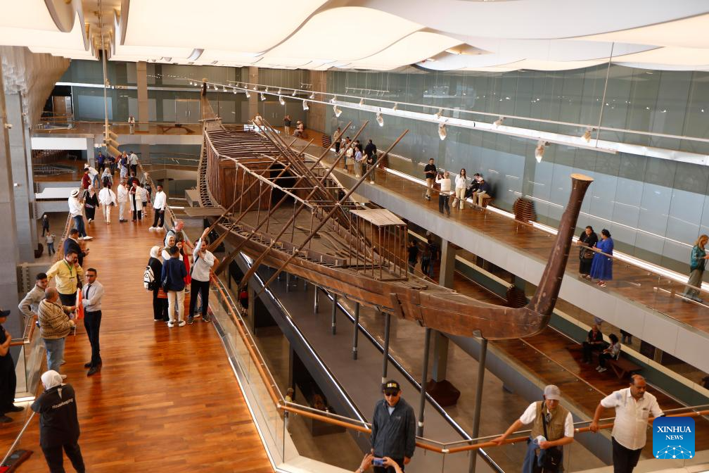 Tourists visit King Khufu's solar boat at the Grand Egyptian Museum in Giza, Egypt, on Nov. 4, 2025. The Grand Egyptian Museum (GEM) , the world's largest museum dedicated to a single civilization, opened to the public on Tuesday. (Xinhua/Ahmed Gomaa)