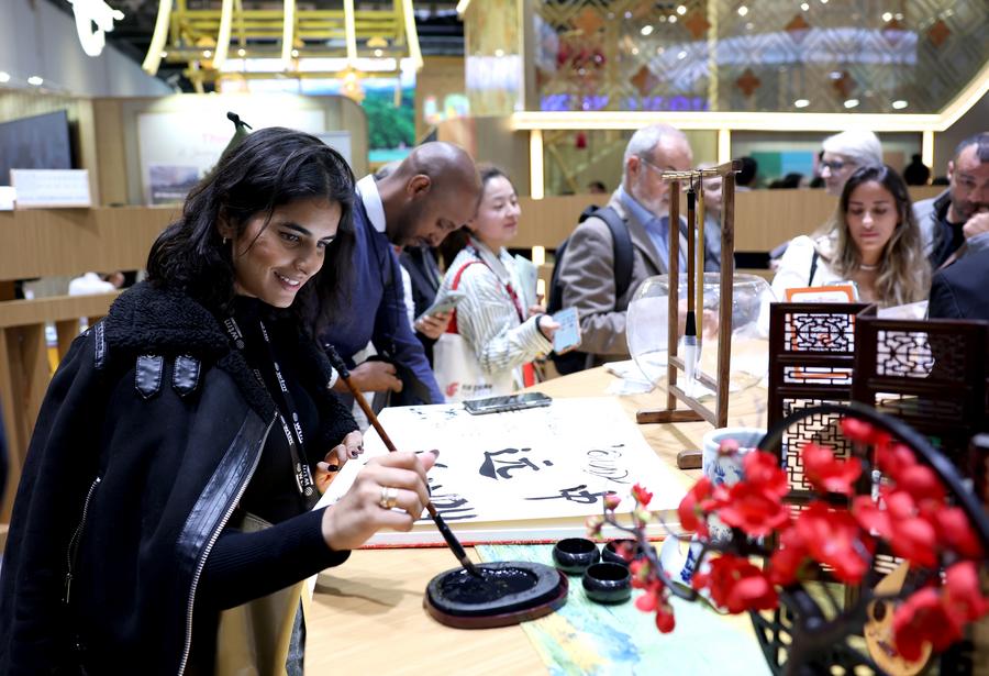 A woman experiences Chinese calligraphy at the China pavilion of the World Travel Market (WTM) London 2025 in London, Britain, Nov. 4, 2025. The WTM London 2025 opened on Tuesday, with the China pavilion drawing attention for its abundant tourism resources and cultural appeal. (Xinhua/Li Ying)