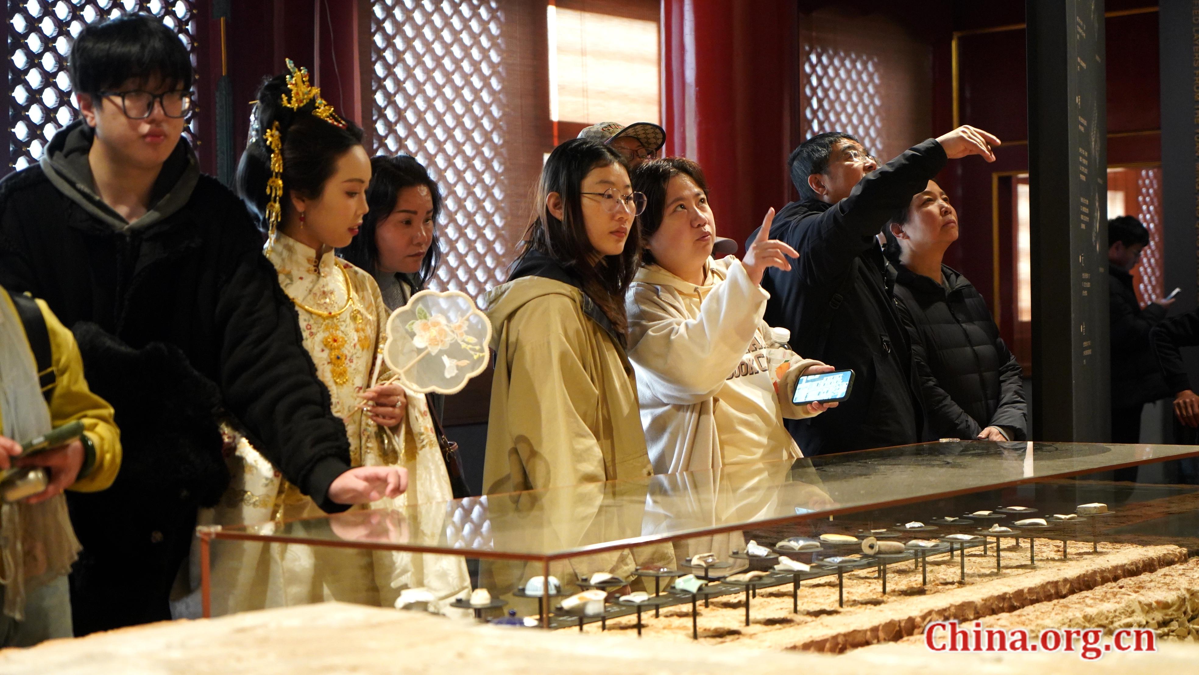 Visitors study a stratigraphic section model of the Imperial Workshops site at the "Beneath the Ninefold Walls: Archaeological Discoveries from the Imperial Workshops Site in the Forbidden City" exhibition at the Palace Museum in Beijing, Nov. 5, 2025. [Photo by Wang Yiming/China.org.cn]