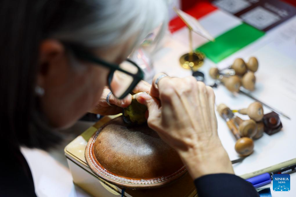 Maria Serena Colombo, an engraver with Italian handmade jewelry brand Manzoni Gioielli, carves on-site at the Consumer Goods Exhibition area during the eighth China International Import Expo (CIIE) in east China's Shanghai, Nov. 9, 2025. (Xinhua/Wang Xiang)