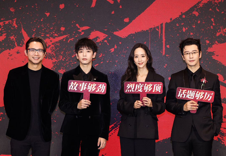 The cast and crew of "The Fire Raven" appear on stage to promote the film at Maoyan's press conference in Xiamen, Fujian province, Nov. 14, 2025. [Photo/China.org.cn]