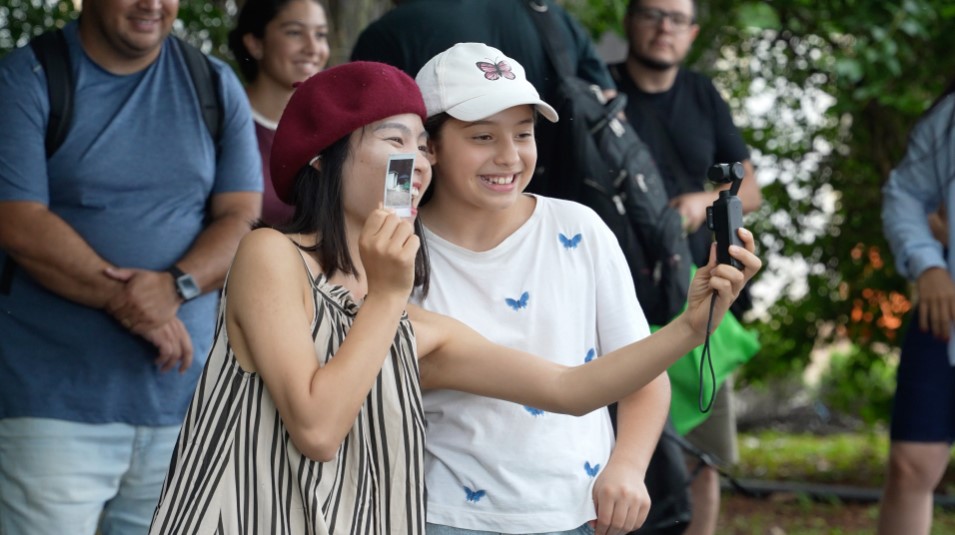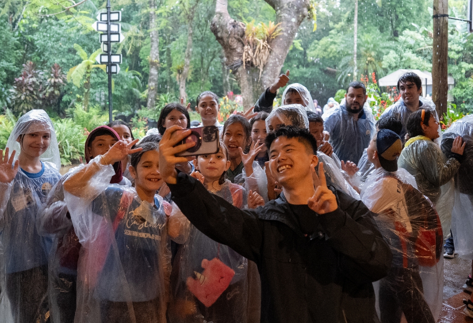 Video blogger Xu Chutao takes a selfie with elementary school students in Foz do Iguaçu, Brazil, during the 2025 "Connecting Cultures: Brazil-China" project, Nov. 10-18, 2025. [Photo provided to China.org.cn]