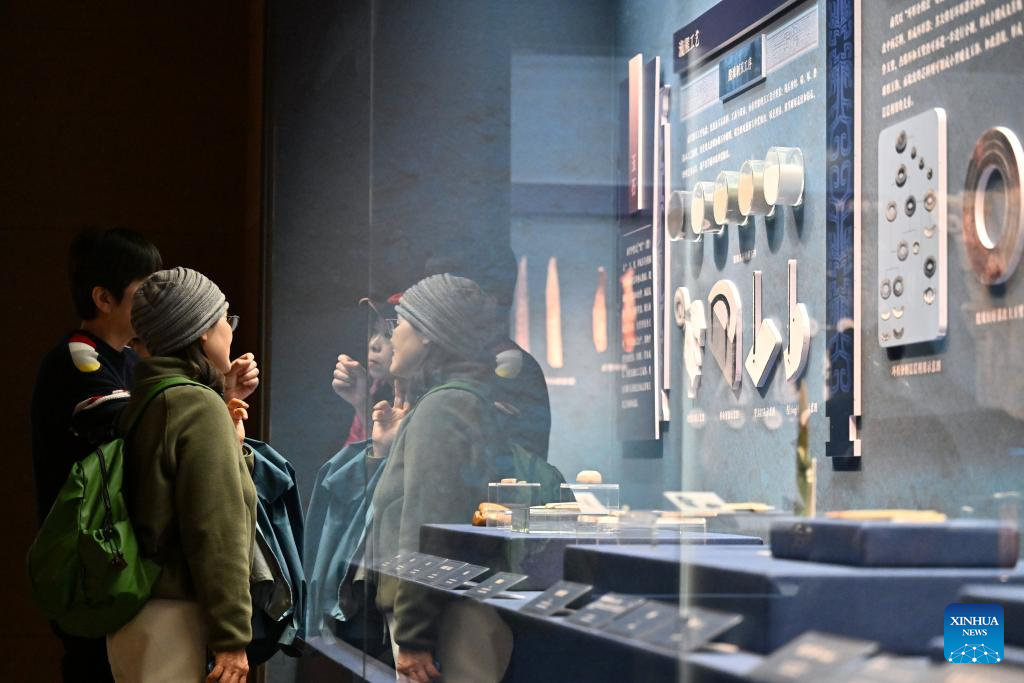 Visitors view artifacts at an exhibition on cultural relics from the Shang Dynasty (1600 BC-1046 BC) at the Tianjin Museum in Tianjin, north China, Nov. 29, 2025. The exhibition, featuring more than 180 pieces (sets) of cultural relics from the Shang Dynasty, has received more than 400,000 visitors since its opening on Aug. 23. (Xinhua/Li Ran)