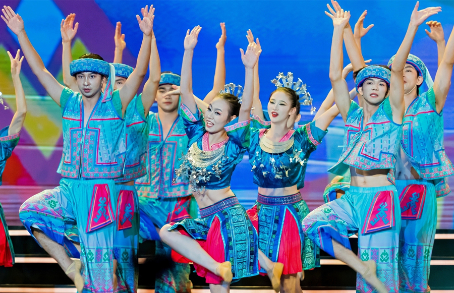 Performers sing and dance on stage at the opening of the 7th Hainan Island International Film Festival (HIIFF) in Sanya, Hainan province, Dec. 3, 2025. [Photo courtesy of HIIFF Organizing Committee]