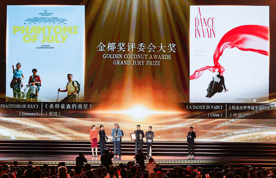 Filmmakers of "A Dance in Vain" and "Phantoms of July" go on stage to accept the Grand Jury Prize at the 7th Hainan Island International Film Festival closing ceremony and the Golden Coconut Awards ceremony in Sanya, Hainan province on Dec. 9, 2025. [Photo courtesy of HIIFF Organizing Committee]