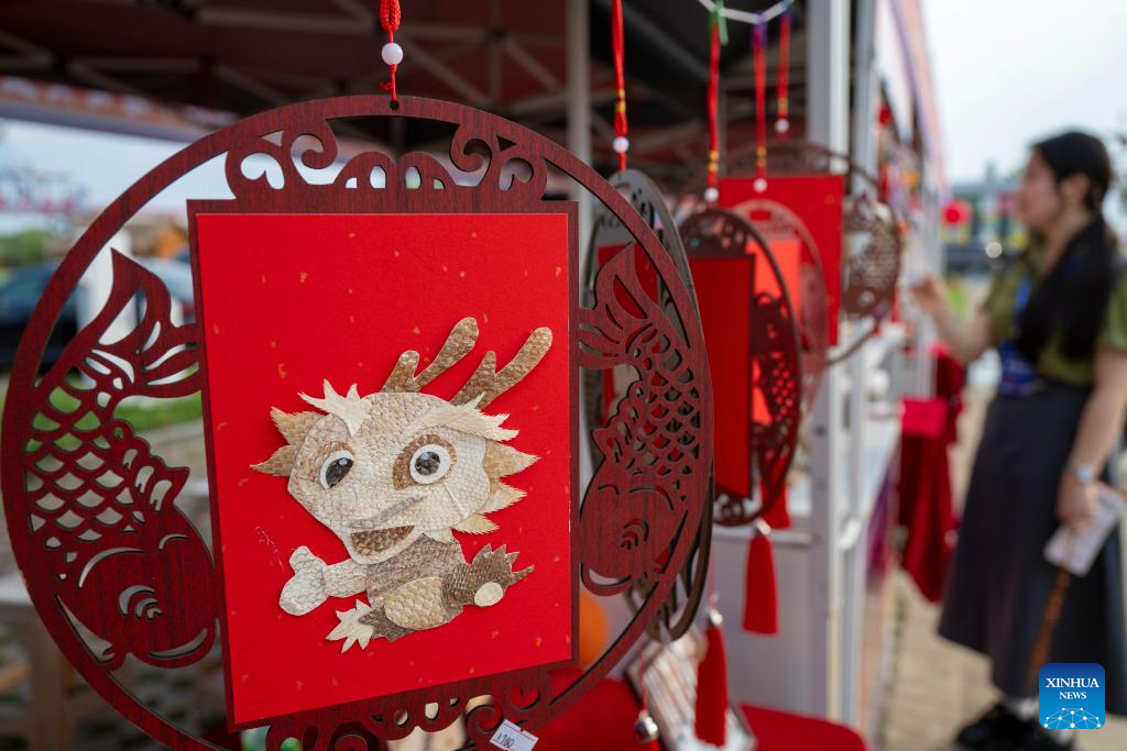 Visitors look at fish skin handicrafts of the Hezhe ethnic group in Fuyuan, northeast China's Heilongjiang Province, July 1, 2025. [Photo/Xinhua]
