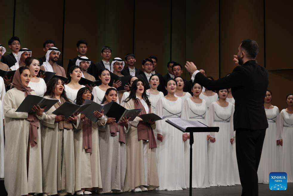The China National Center for the Performing Arts (NCPA) Chorus, rehearse with Choralla, a local Saudi choir, for the World Famous Songs Concert at the King Abdulaziz Center for World Culture, in Dhahran, Saudi Arabia, Dec. 11, 2025. Chinese and Saudi artists performed together on Thursday in a concert that marked the highlight of the NCPA Chorus's first tour in the kingdom. [Photo/Xinhua]