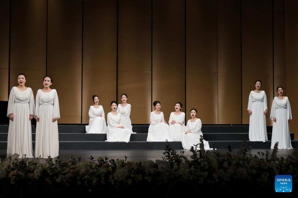 The China National Center for the Performing Arts (NCPA) Chorus perform at the World Famous Songs Concert at the King Abdulaziz Center for World Culture, in Dhahran, Saudi Arabia, Dec. 11, 2025. Chinese and Saudi artists performed together on Thursday in a concert that marked the highlight of the NCPA Chorus's first tour in the kingdom. [Photo/Xinhua]